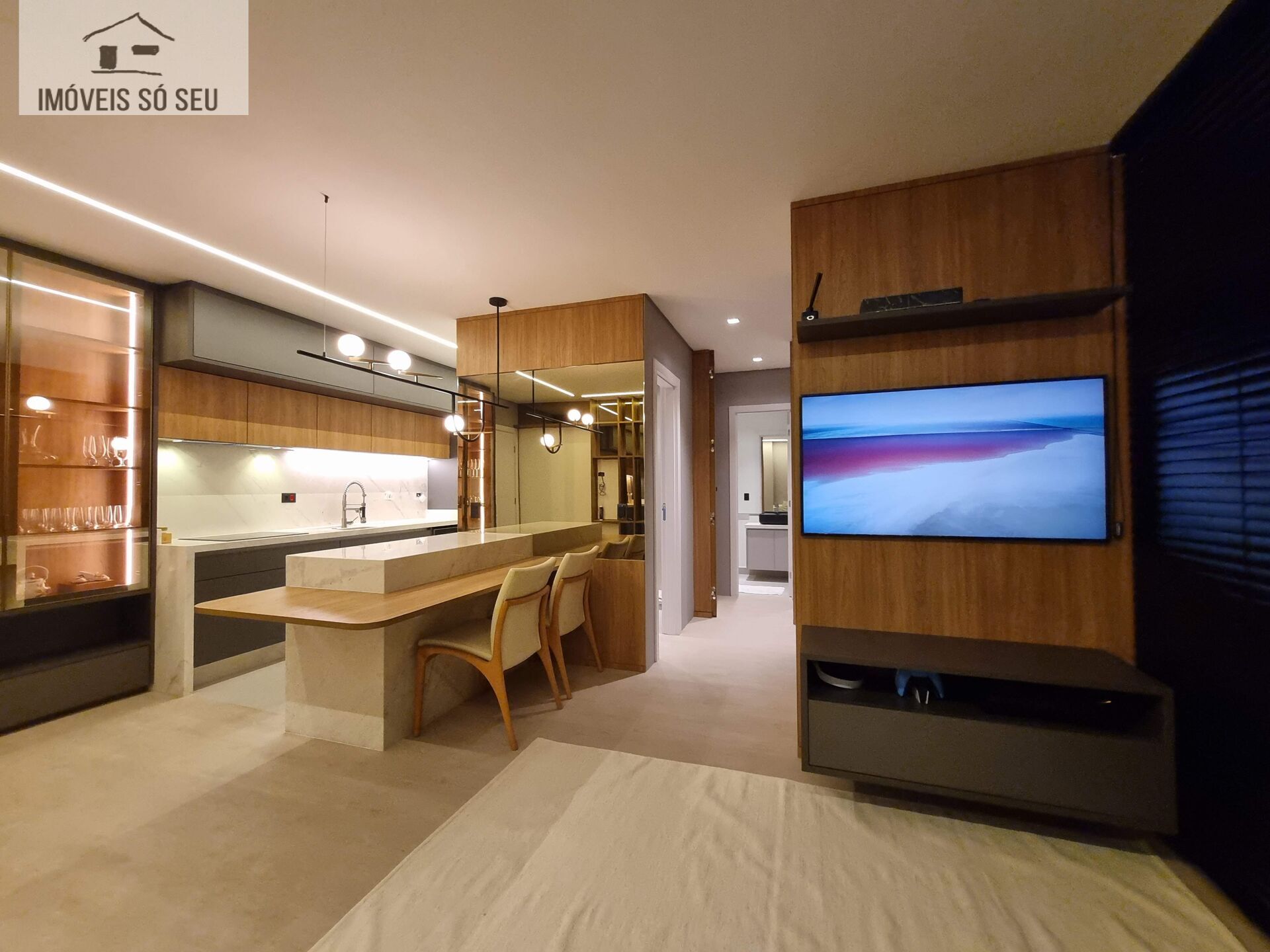 Dois dormitórios, cozinha gourmet integrada com a sala, 8º andar, frente, e o que é importante são as duas vagas na garagem.